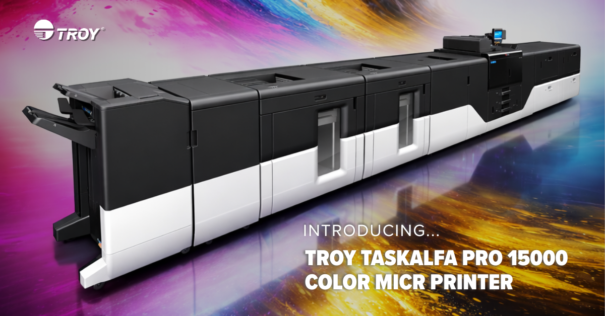 Wheeling, West Virginia – Die TROY Group, seit mehr als 60 Jahren weltweit führend im Bereich sicherer On-Demand-Drucklösungen, gab heute die Markteinführung des TROY TASKalfa Pro 15000 Color MICR-Druckers bekannt, eines Hochgeschwindigkeits-Bogen-Inkjet-Produktionsdruckers, der speziell für den Druck von MICR-Schecks in großen Auflagen entwickelt wurde.